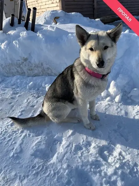 Овчарка, бело-черная, по признакам явно потерялась, беспокойно бегает и обнюхивает