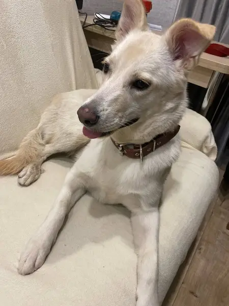 Найден кобель белого окраса, молодой, уши стоят, нос светлый, глаза темные, на высоких лапах, некастрированный. Был без ошейника. Бегал в стрессе по ул. Николая Старостина дом 5. Забрала на ночь.