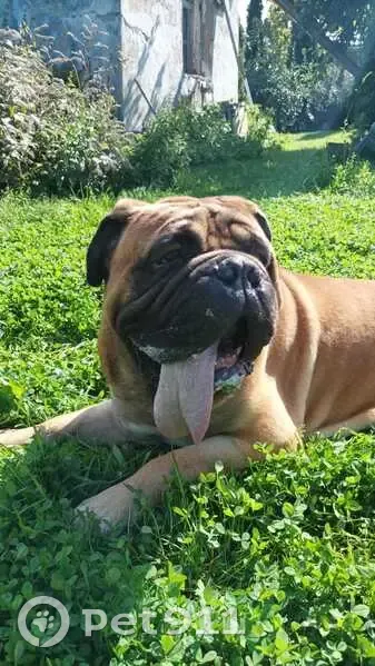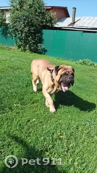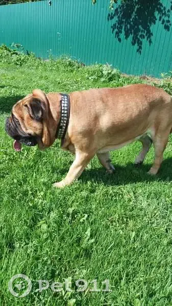 Кобель породы предположительно мастиф, в широком ошейнике, адекватный, ухоженный, голодный. Найден в Южнобутовском лесу возле Бутовского кладбища.