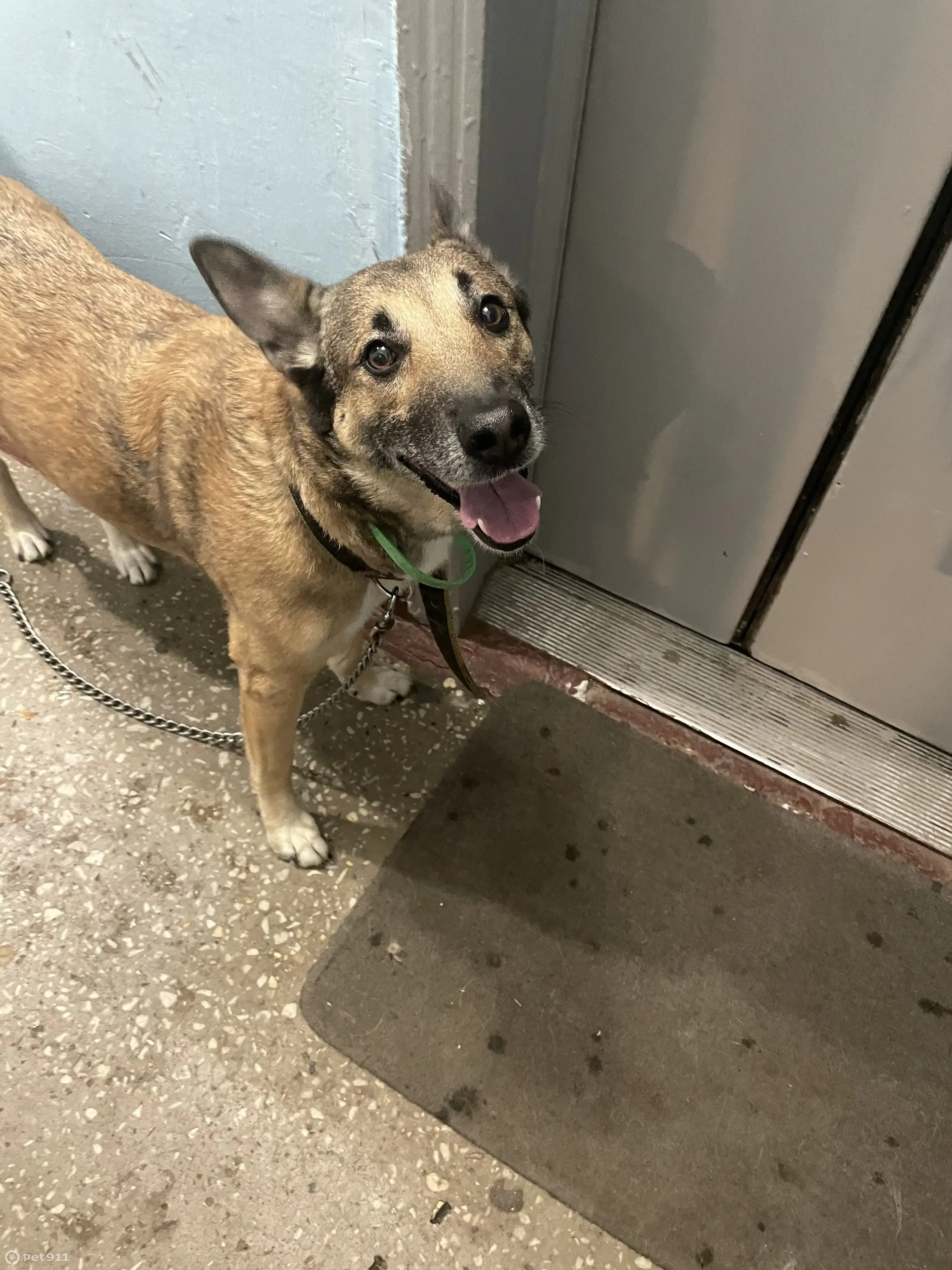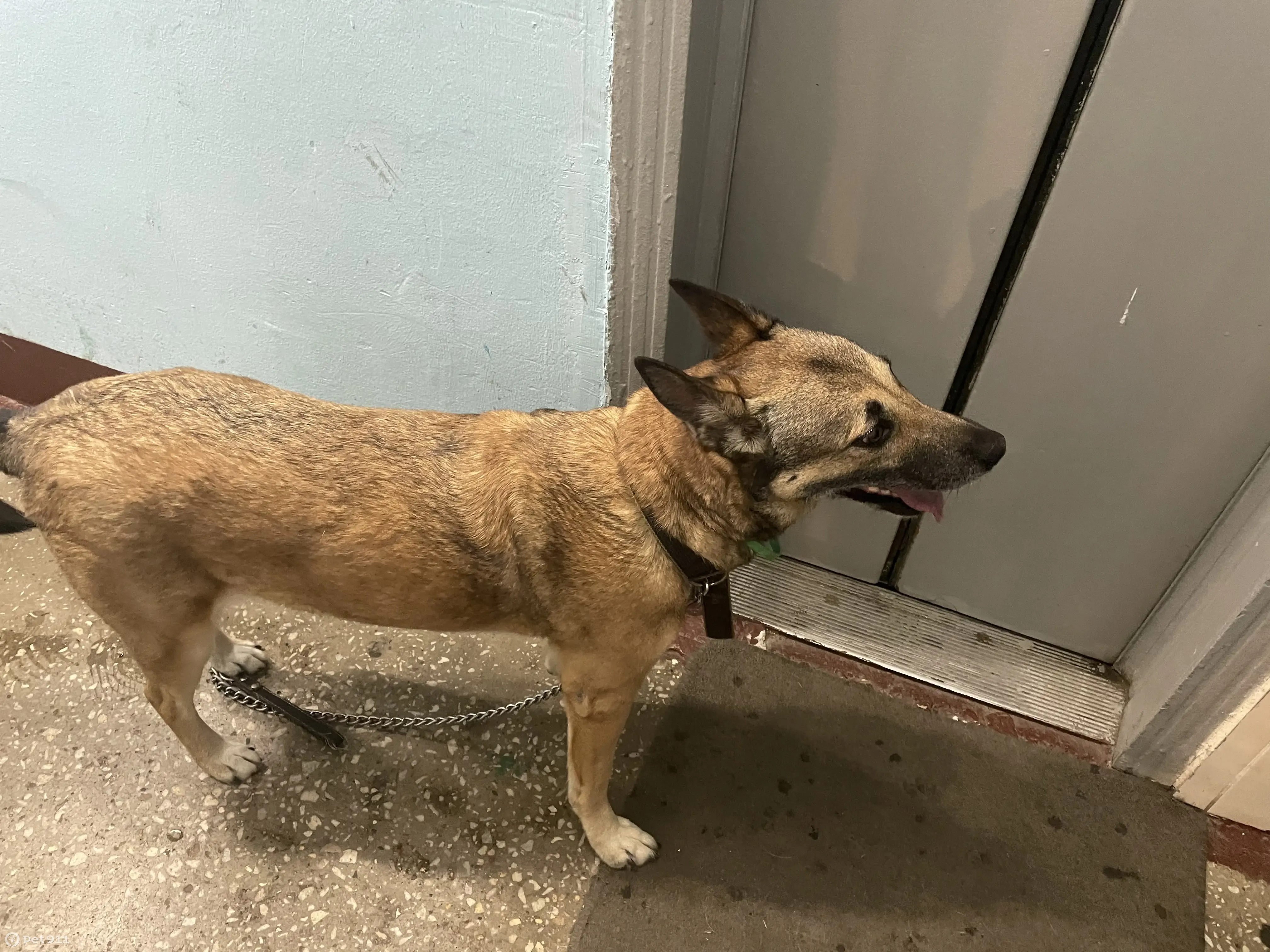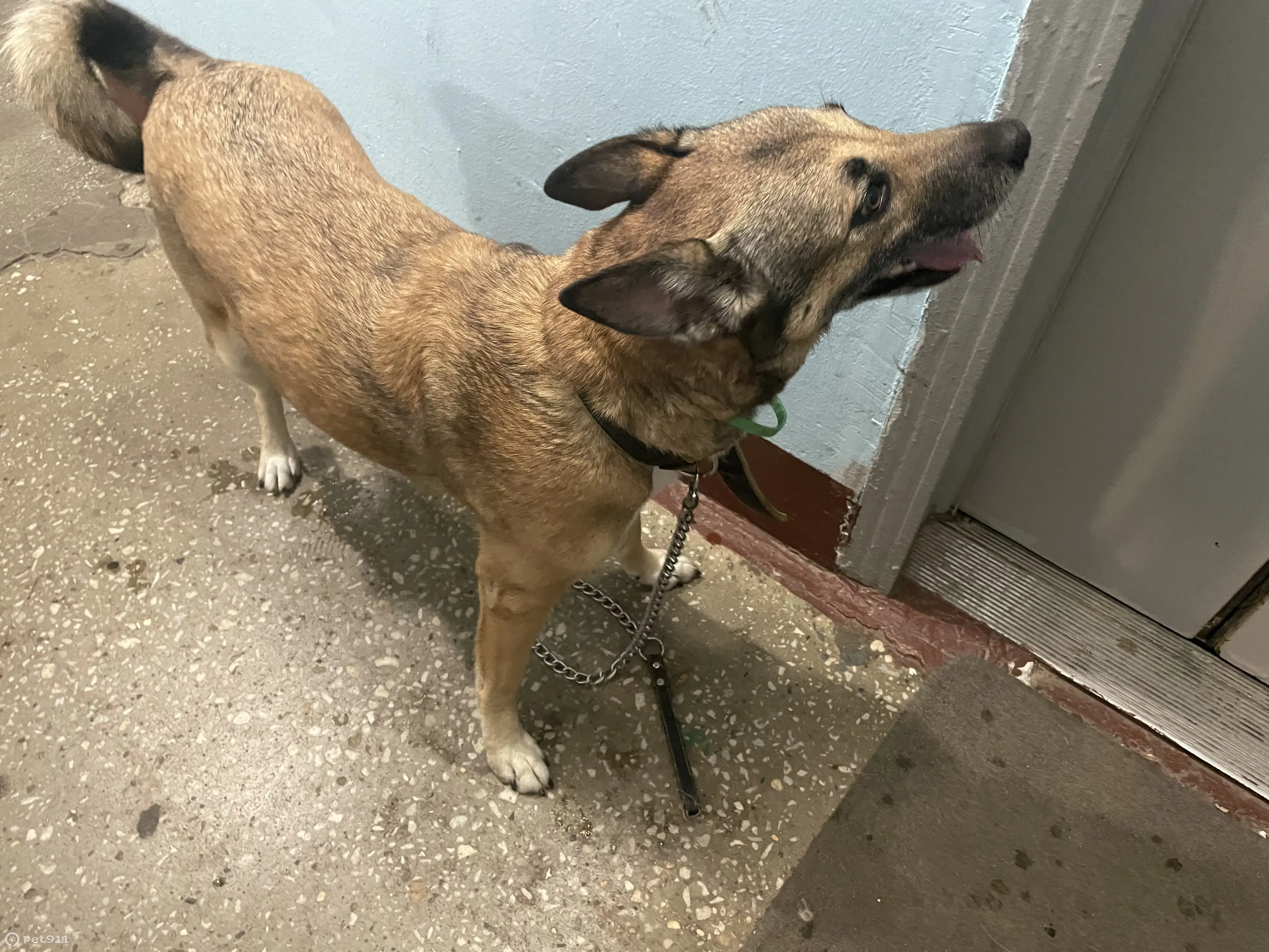 Собака с ошейником один кожаный другой зеленый тонкий. Район Строгино, она с поводком видимо сорвалась и убежала