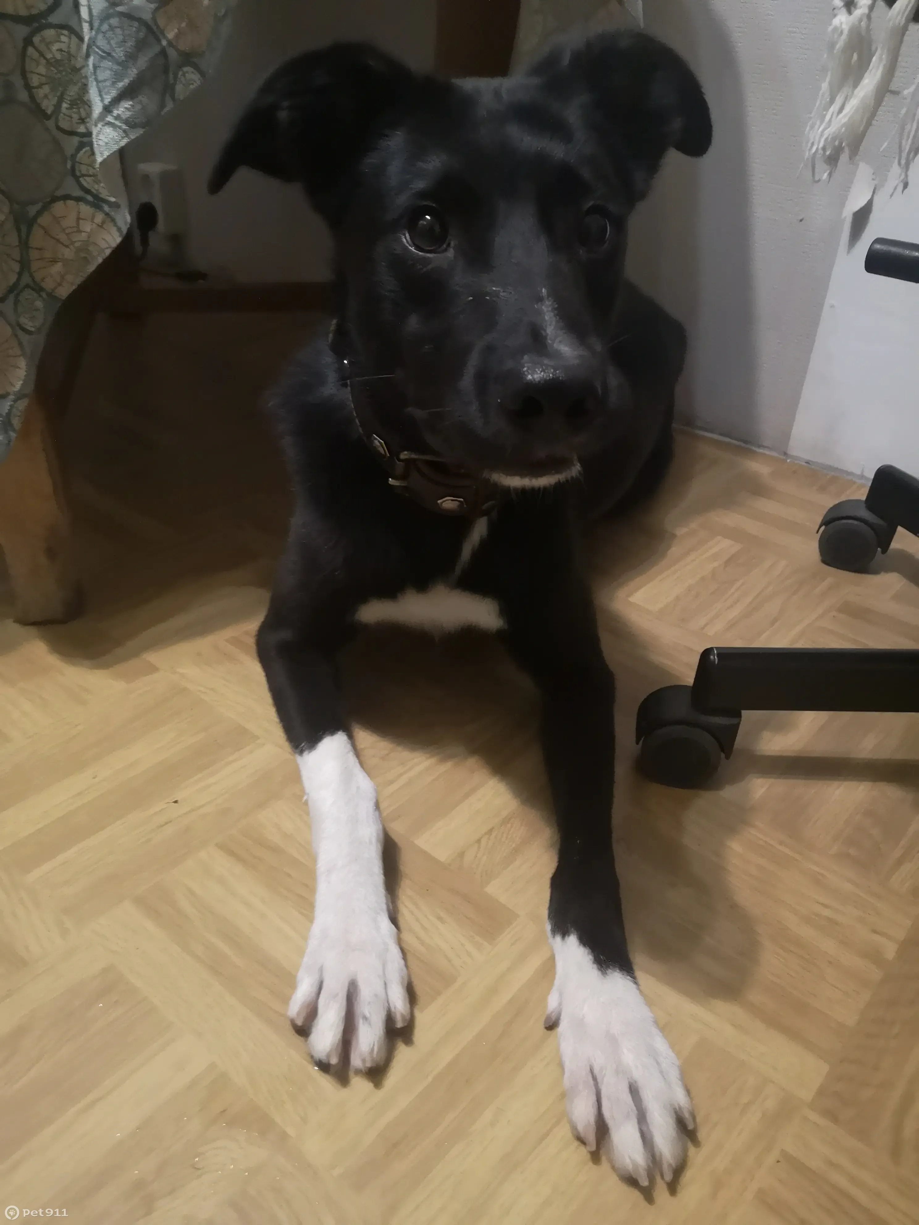 16.08.23, На Головинских прудах вечером, в районе 21.30 найден молодой пёс чёрного окраса. На груди и лапах белые пятна. На вид меньше года. На нем широкий коричневый ошейник с заклепками. Пёс чуть меньше овчарки, дворняжка. Худой и голодный, но видно, что домашний. Пёс был испуган, не знал куда идти. Не агрессивный, очень любопытный. Знает команду сидеть, лежать, дай лапу.