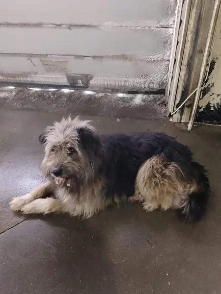 Окрас преимущественно серый, а снизу туловища и лапы рыжие., много шерсти, зарос. Ошейника не видно было, пол тоже не видела. Прошёл сквозь парк Маяк, что-то искал.