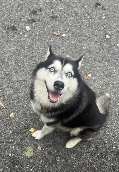 Хаски метис, возраст предположительно пол года, год. Была привязана к дереву, явно брошена. Красная шлейка маловата и зелëный поводок тканный, весь в узлах.