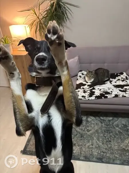 Метис. Был найден на улице, несколько дней бродил по улице. Был ужасно уставший, замерзший и голодный. Очень боялся людей и убегал от них. Пёс очень умный и видно что домашний. Знает много команд, до сих пор не все их раскрыли. Сейчас очень сильно любит людей, любит играться и очень добрый Малыш