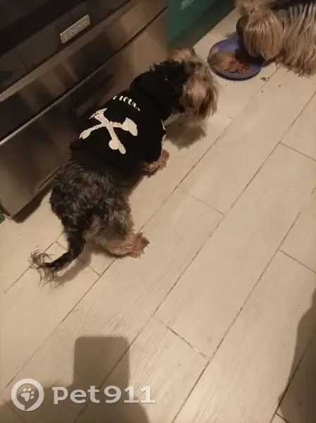 Найдена собака, мальчик, йоркширский терьер. Бегал около ул. Марьинский парк, д. 35. Одет в черный комбинезон с рисунком из косточек. 89031721738 Лидия