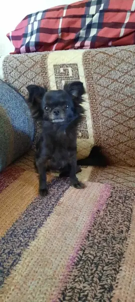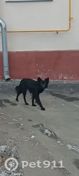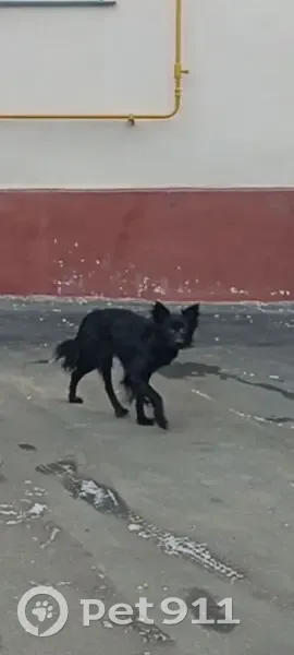 Черная, невысокая, с пушистым хвостом. Пугливая, подойти не дает. Появилась в ночь на 18-е февраля, ходит по двору. Вроде в ошейнике, но плохо видно на фоне темной шерсти.
