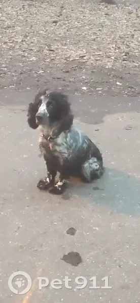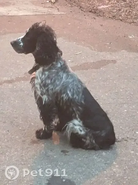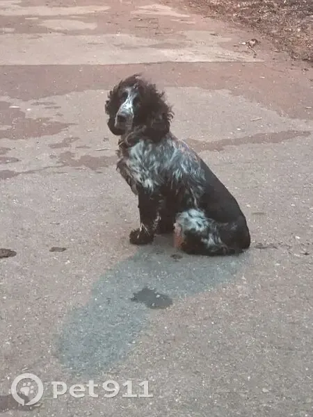 Собака найдена сидящей между Дубнинской 32 и ул. 800 летия Москвы в 18:15. Пол определить не удалось. На шее ошейник. Порода похожа на русского охотничьего спаниеля. Чёрно-белый окрас.