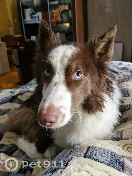 Мальчик, похож на Бордер-колли, бело-светлокоричневый, морда в пятнышко, глаза светло голубые, зрачки синие, нос цвета молочного шоколада, носочки лап белые, кончик хвоста белый, грудка белая.