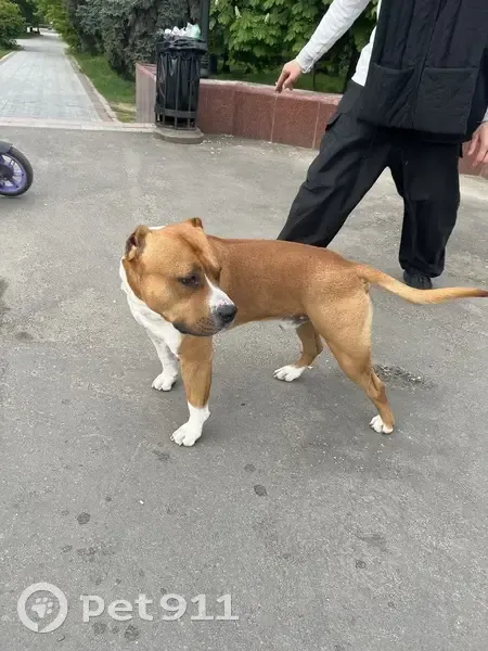 Рыже-белый стаффордширский терьер , уши купированные, найден в районе Китай-города без ошейника в 6:30 17 мая, ручной, знает команды. Найден без ошейника. Не лает. Спокойный.