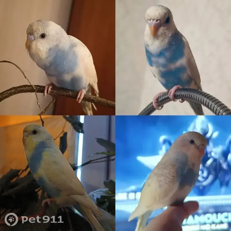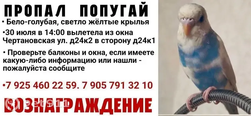 Волнистый попугай, жёлтая голова, голубое тело с белыми пятнами. Крылья почти без полос, желтоватого оттенка, очень яркий оранжевый клюв. Около 14:00 вылетела из окна дома 24к2 в сторону дома 24к1 Чертановской ул