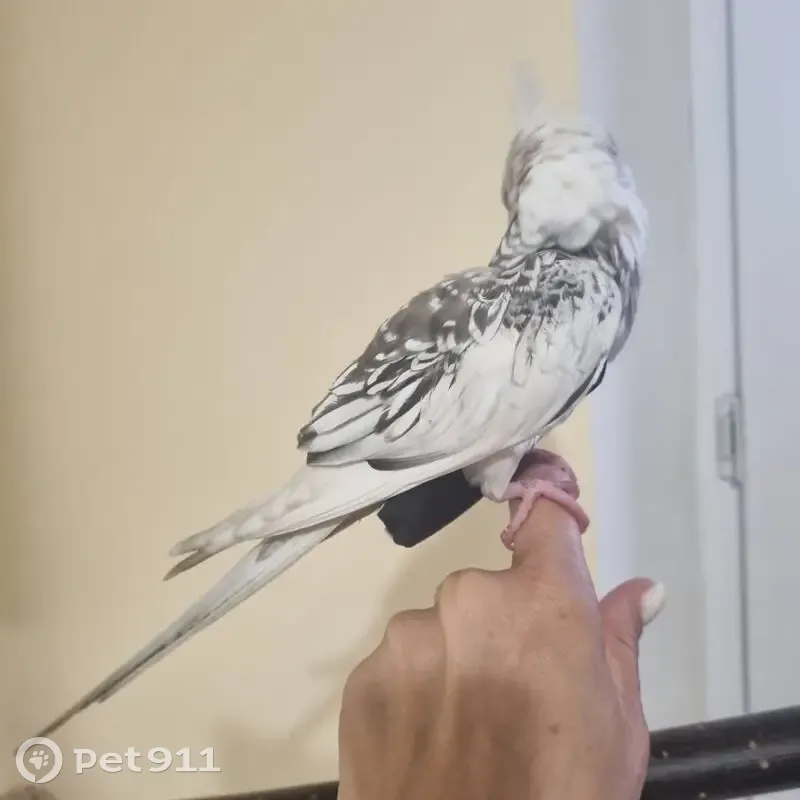 Безщекий, почти белый, перышки жемчужные серые. Домашний, не пугливый.