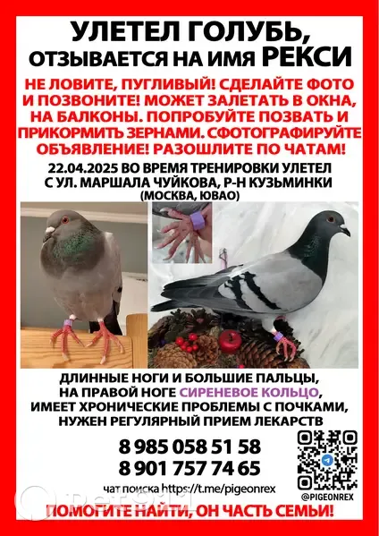 Есть отличия от уличных голубей: изящное вытянутое телосложение, длинные ноги и пальцы, аккуратное гладкое оперение. Может пушиться от холода или грусти, стоять на одной ноге как цапля. На правой ноге СИРЕНЕВОЕ КОЛЬЦО. Очень деликатный, возможно, будет сидеть где-то один. Может залететь на балконы и окна, не прогоняйте и не хватайте, прикормите зерном и свяжитесь со мной!