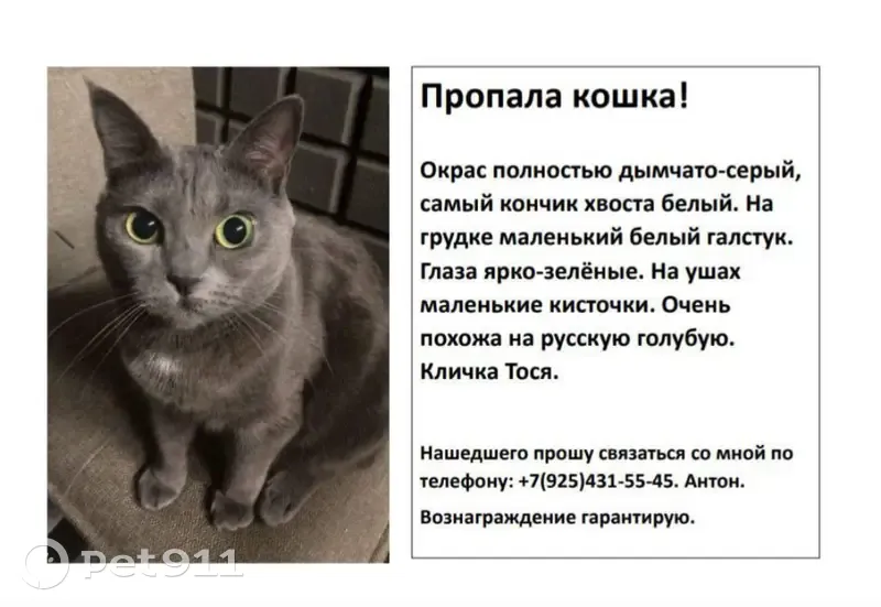 Помесь с русской голубой. Зелёные глаза. Белое пятнышко на грудке и кончик хвоста беленький. Маленькие кисточки на ушках. Пропала на северном бульваре, выпала с 4 этажа. Вчера ее видели на Бестужевых 27, мордочка разбита, истощена. Объявление увидели только сегодня. Кошечка в плохом состоянии. Если увидите, позвоните пожалуйста