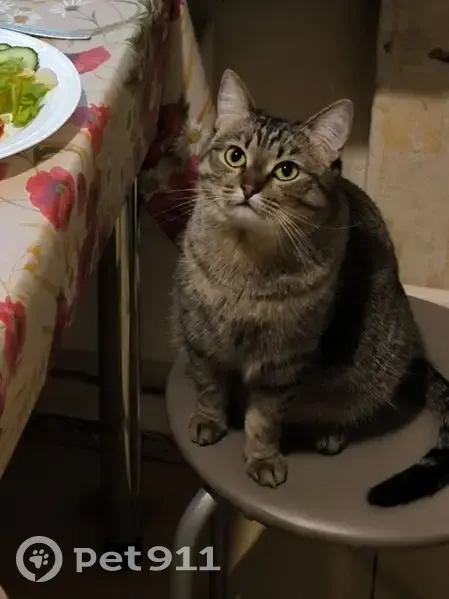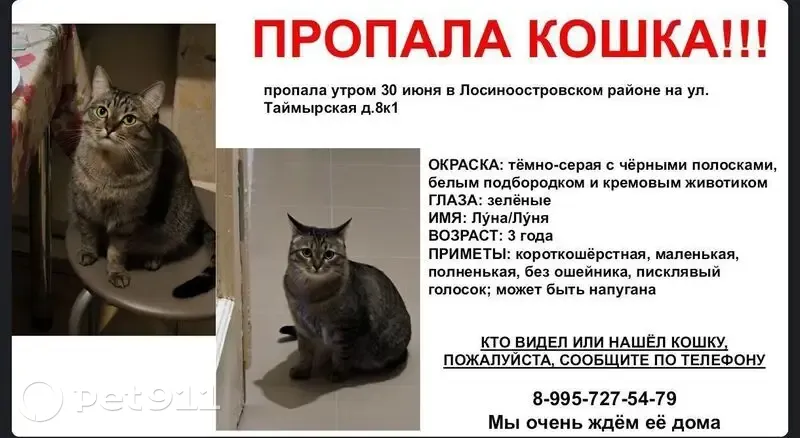 ОКРАСКА: тёмно-серая с чёрными полосками, белым подбородком и кремовым животиком ГЛАЗА: зелёные ИМЯ: Лу́на/Лу́ня ВОЗРАСТ: 3 года ПРИМЕТЫ: короткошёрстная, маленькая, полненькая, без ошейника, писклявый голосок; может быть напугана