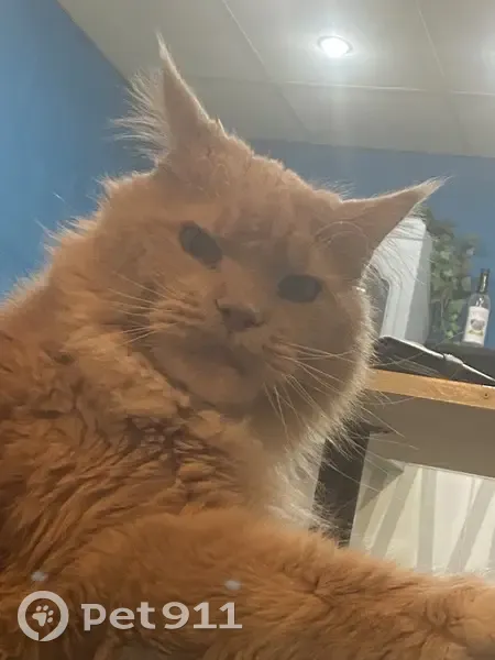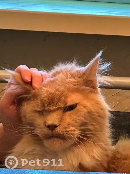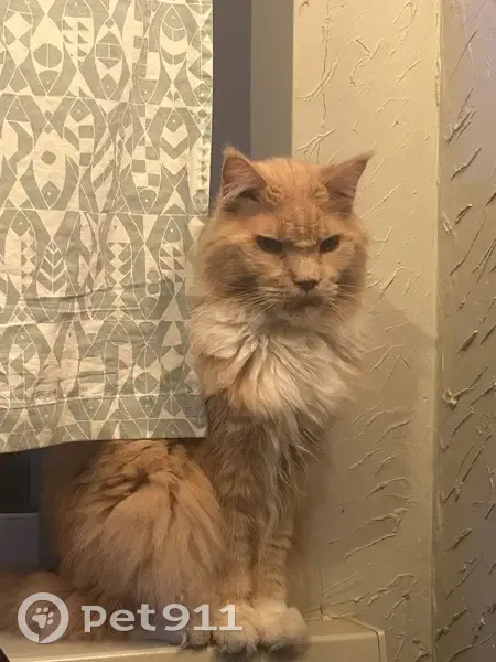 Мейнкун рыжий с белым, худощавый, больше похож на котенка, чем на взрослого представителя этой породы. Справа на челюсти шрам, там же нет нескольких зубов(прыгал из окна). Достаточно боязливый, умеет очень громко мяукать. На животе шерсть кудрявая) Кастрирован.