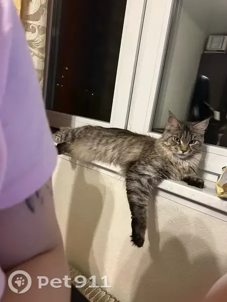 Пепельно-серая с оттенками : черный,белый, коричневый Чистокровный мейн-кун Выпала с 8 этажа 19 июля после 15:00, кошка болеет. За денежное вознаграждение