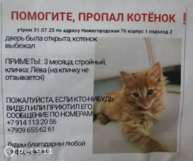 Рыжий, пушистый, стройный. Ласковый, когда игривый кусается, любит прятаться в укромные места, на имя не отзывается, отзывается на мышек и гремящие шарики с бубенчиками, на шуршание корма,тихо мяукает. Утром дверь была открыта в квартире на 12 этаже (все окна были закрыты) и он выбежал. С тех пор мы его не видели. Спрашивали у соседей говорили нету Писать в телеграмм или WhatsApp на номер +79096556261