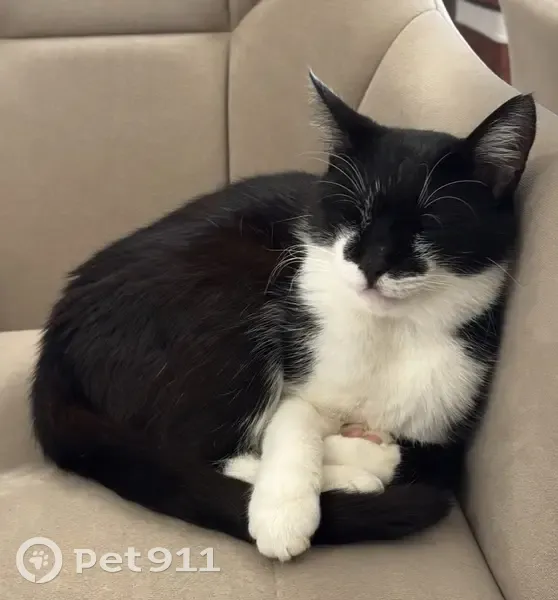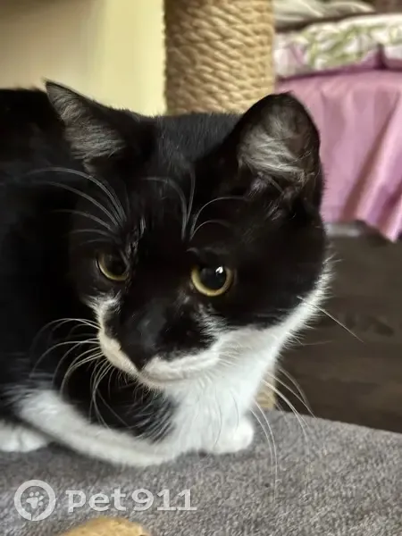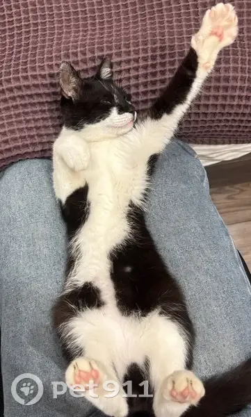 Пол: Самец Окрас: черно-белый Особые приметы: черно-белый окрас, лапы и живот белые, спина черная, пугливый, очень ласковый, кастрированный. Сорвался с повадка, вели к ветеринару.