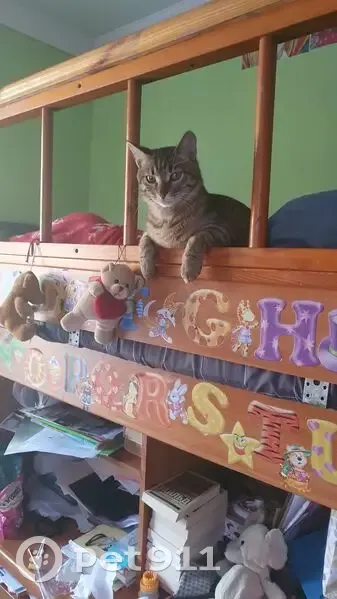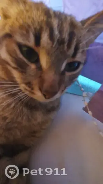 Серый метис, окрас почти тигриный, зеленые глаза, поломан кончик хвоста, возраст чуть больше года, вышел вечером гулять и не вернулся. Чужим в руки не дается.