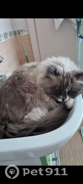 Пропал кот. Кличка Альф. Возраст 9 лет. Окрас: светлый Blue Point, мордочка тёмная. Большие голубые глаза. Достаточно крупный. Шерсть длинная, светлая. Хвост длинный, пушистый. Очень добрый, ласковый кот. Парода Невский-Маскарадный.