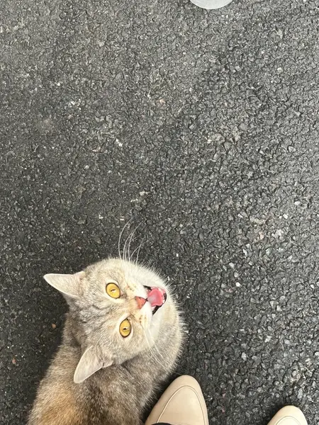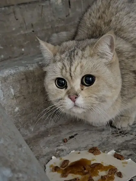 Шотландский вислоухий кот, 8 лет, средних размеров. Окрас в основном коричневый, но так же присутствуют чёрный, бежевый и белый. Подушечки на лапках фиолетового цвета, как и губы. Зелёные глаза