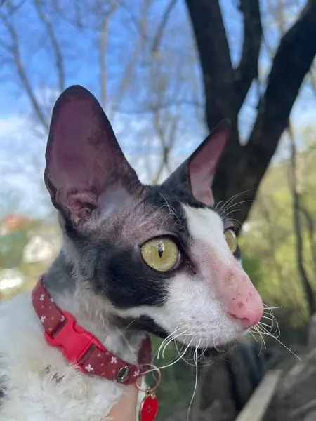 Темно серый окрас, розовая шея и лапки. Канадский сфинкс