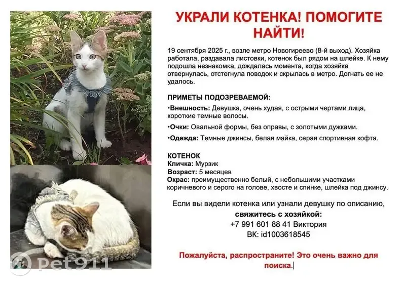 19 сентября 2025 года, возле метро Новогиреево (8-й выход). Хозяйка работала, раздавала листовки, котенок был рядом на шлейке. К нему подошла незнакомка, дождалась момента, когда хозяйка отвернулась, отстегнула поводок и скрылась в метро. Догнать ее не удалось. КОТЕНОК Кличка: Мурзик Возраст: 5 месяцев Окрас: Белое тело, голова и хвост рыже-серые, шлейка под джинсу ПРИМЕТЫ ПОДОЗРЕВАЕМОЙ: • Внешность: Девушка, очень худая, с острыми чертами лица, короткие темные волосы. • Очки: Овальной формы, без оправы, с золотыми дужками. • Одежда: Темные джинсы, белая майка, серая спортивная кофта.