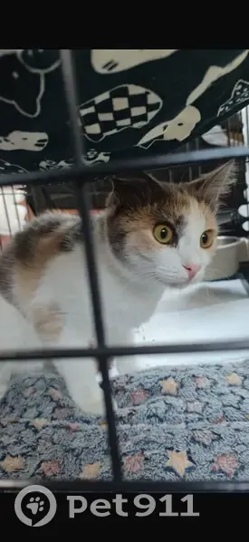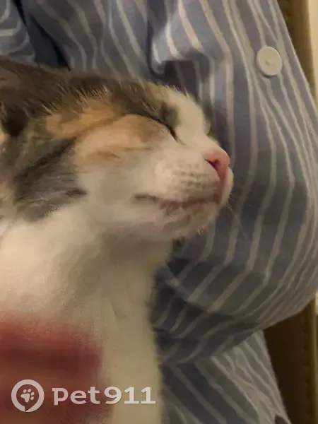 Молодая кошка худенькая. 3х цветная. Белая внизу, рыжие пятна и серые с рыжем спина. Уши тоже серые. На суставе передней лапы рыжее пятно. Сбежала из переноски во время выхода с поезда. Чаще шипит на незнакомцев чем мяукает. Мяукает тихо.