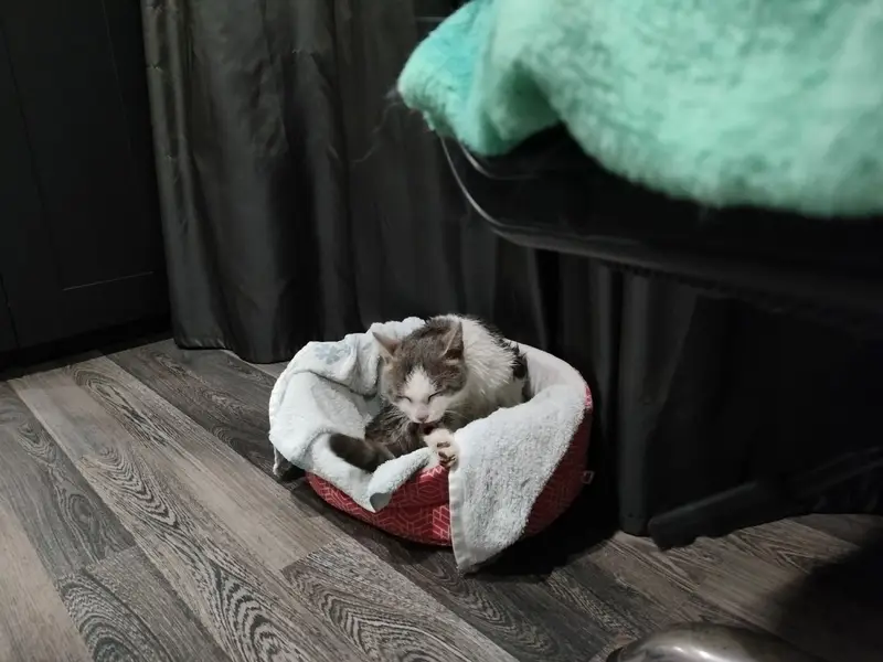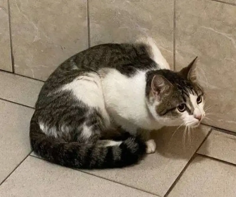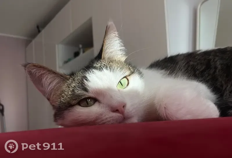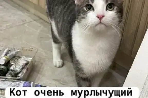 Кот абсолютно домашний, никогда не видел улицу, поэтому, скорее всего, сейчас очень пуглив. Окрас серо-белый с проседью. На голове типа серой шапочки, доходит треугольником до глаз, белый воротничок по всей окружности шеи, Белая грудь, живот и лапки. Спина до боков серая. Хвост полосатый. Кот взрослый, но выглядит как годовалый кот-подросток. Средних размеров, совсем не толстый.