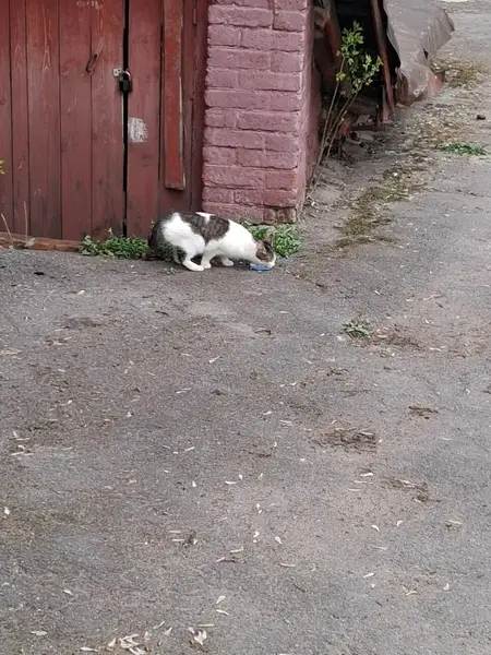Лапы и шея белая. Остальное полосатый серый с черным. Слезится правый глаз