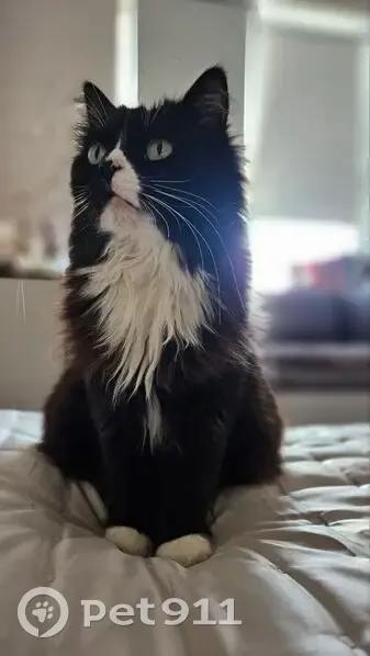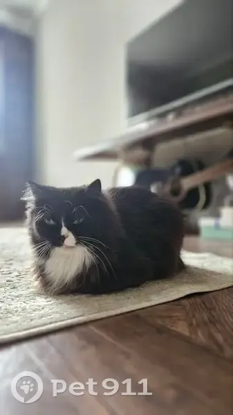 порода: беспородный окрас: черный с белыми лапками и белой грудкой, длинные белые усы, длинношерстный, немного приоткрыт рот,без хвоста. Чипирован, примерно 5 лет, кастрирован. Кот домашний, может быть напуган и прятаться в подвалах, под машинами или подъездах. Очень осторожный, недоверчивый. Может подойти за едой, но поймать себя или взять на руки не даст, лучше попробовать набросить куртку и словить.