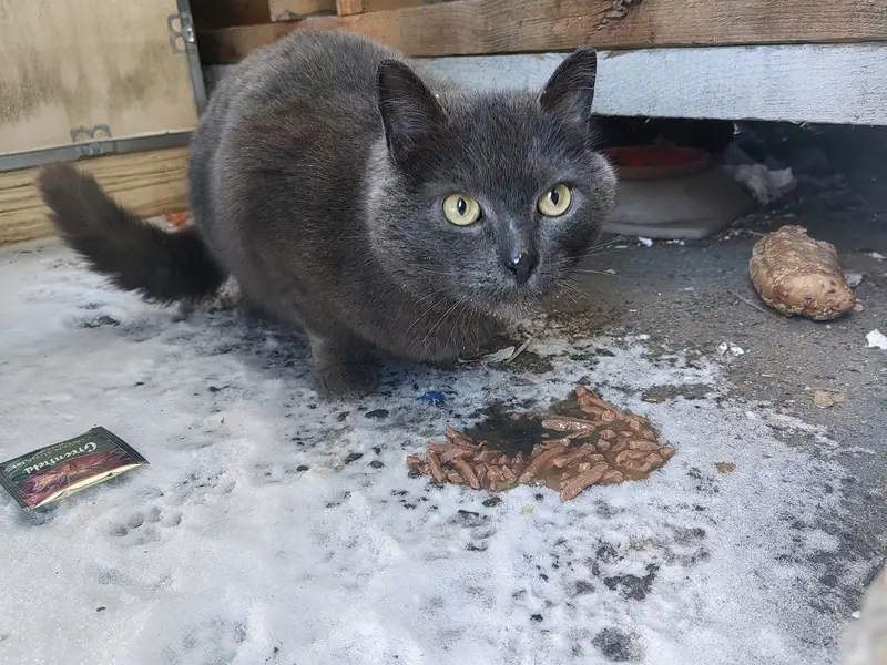 Кот дымчатого окраса (серый). Порода Русская голубая. Кличка Мушон. Кот контактный, ласковый, пугливый на громкие звуки. На шее висит металлический кулон адресник цилиндрической формы.