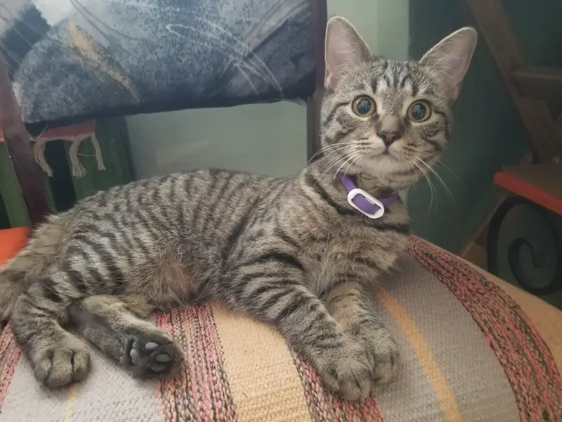 Срый с чёрными полосками, носик и подушечки лап черные