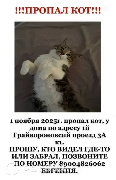 Пропал Кот по кличке Крис, 3 года, окрас темно серо полосатый.Грудь, брюшко, шея, лапки белые. Легко идёт на руки, очень ласковый. Мордочка в раёне усов левая сторона белая, правая серая.