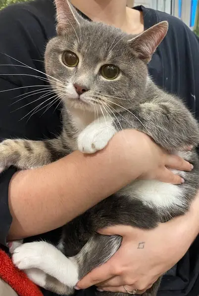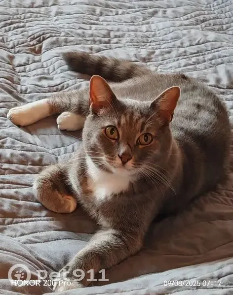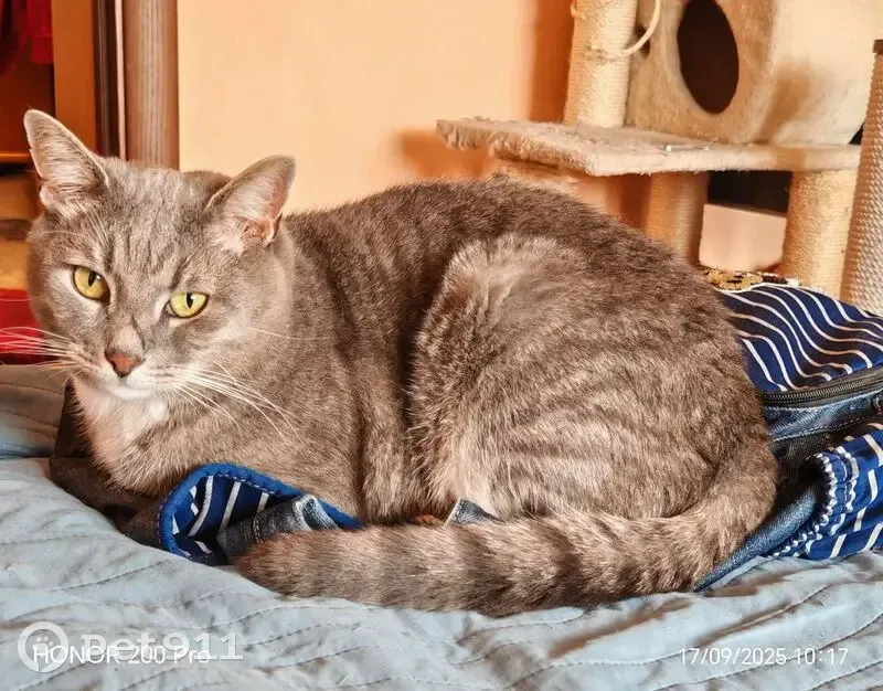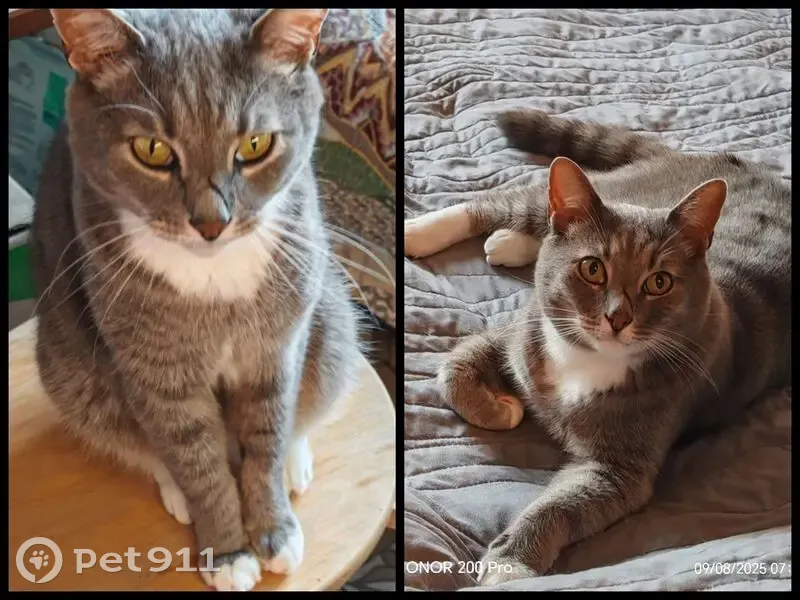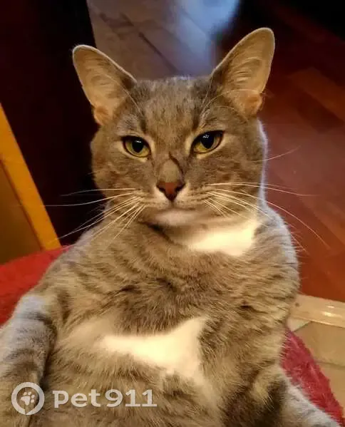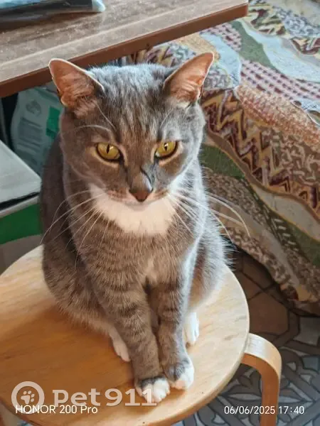 Объединено с объявлением rl1105344. Причина-дублирование информации. Описание дублирующего объявления: Серый полосатый, похож на британца. Белые лапки и грудка. Особая примета- шрам на носу.