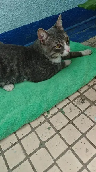 Серый полосатый, похож на британца. Белые лапки и грудка. Особая примета- шрам на носу.