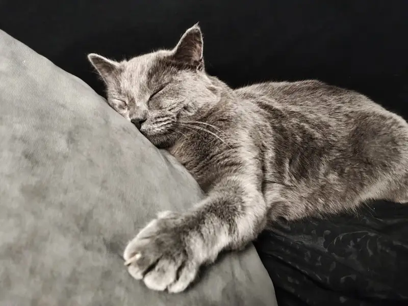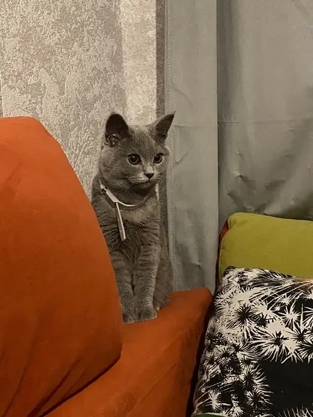 Окрас серый - лиловый . Пугливый так как очень домашний . Ухоженный