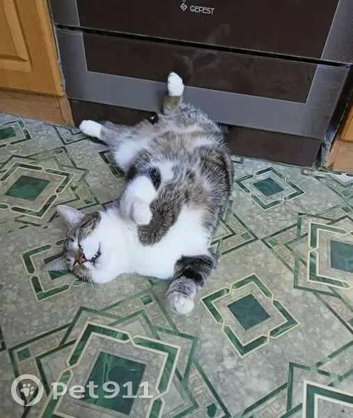 Окрас на спине коричневый, похож на бенгала, на грудке и лапах, белые пятна. Кончик хвоста искривлен. Вылез из окна. Чужим не даётся, может царапаться.