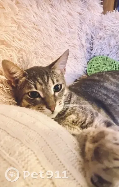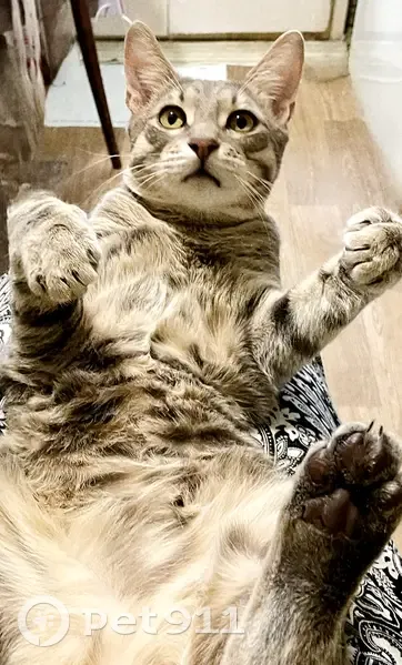 Котик достаточно высокий в холке за счёт длинных лап, не из пугливых. Кастрирован, полосатый (на спине полосочки практически исчезают и перетекают в сплошное коричнево-серое пятно вдоль всего позвоночника), сломан кончик хвоста (визуально не видно, но чувствуется на ощупь). Выбежал из машины и испарился в неизвестном направлении. Возможно был замечен в декабре по адресу ул. Молдагуловой, 16А, но информация неточная.