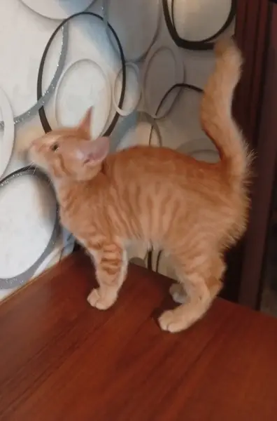 Рыжий в полоску, мальчик, возраст 4-5 месяцев, игривый, ладит с людьми. Делали ремонт открыли дверь для выноса мусора и видимо выбежал, думал сначала испугался и спрятался.