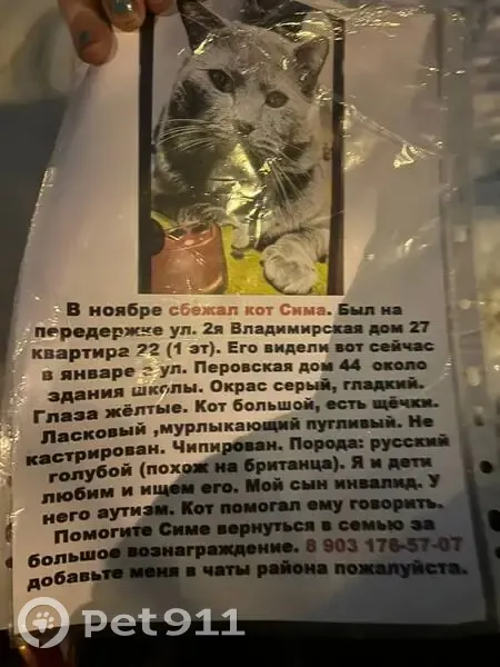 В ноябре сбежал кот Сима. Был на передержке ул. Я Владимирская дом 27, кв 22. Его видели в январе на ул. Перовская дом 44, около здания школы. Окрас серый, гладкий. Глаза желтые. Кот большой, есть щечки. Ласковый, мурлыкающий пугливый. Не кастрирован. Чипирован. Порода: русский голубой (похож на британца). +79031765707