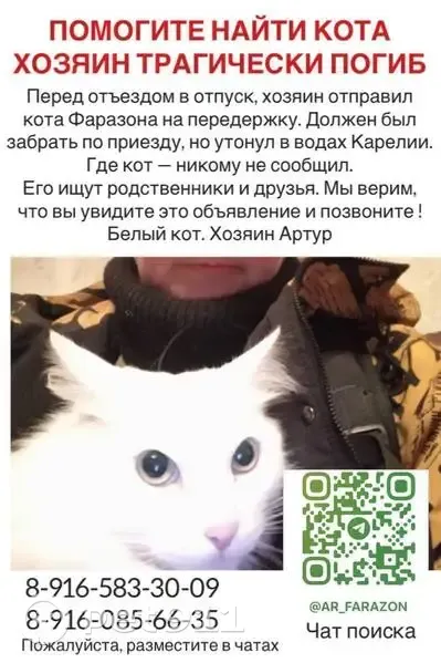 Ищем белого кота Фаразона. Его хозяин, Артур, трагически погиб 2 дня назад в походе на Ладожском озере, утонул. Кота перед походом отдал на передержку, вероятно с 3 по 6 февраля. Где именно находится кот, хозяин никому не сообщил. Друзья и родственники ищут по всей Москве и Московской области. Кота не бросили, не забыли, он нужен, его заберут. Помогите нам в этой беде.