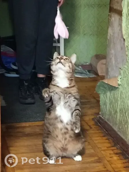 Тигровый (макрель): Вертикальные полосы, как у тигра ,. На задних лапках белые носочки , и белый галстук. Ласковый , дружелюбный. Дверь оставили открытой.