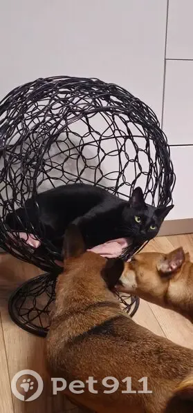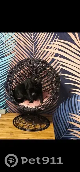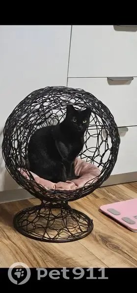 Черная кошка с белым пятном под передней лапой и между задних лап. Выпрыгнула в окно первого этажа