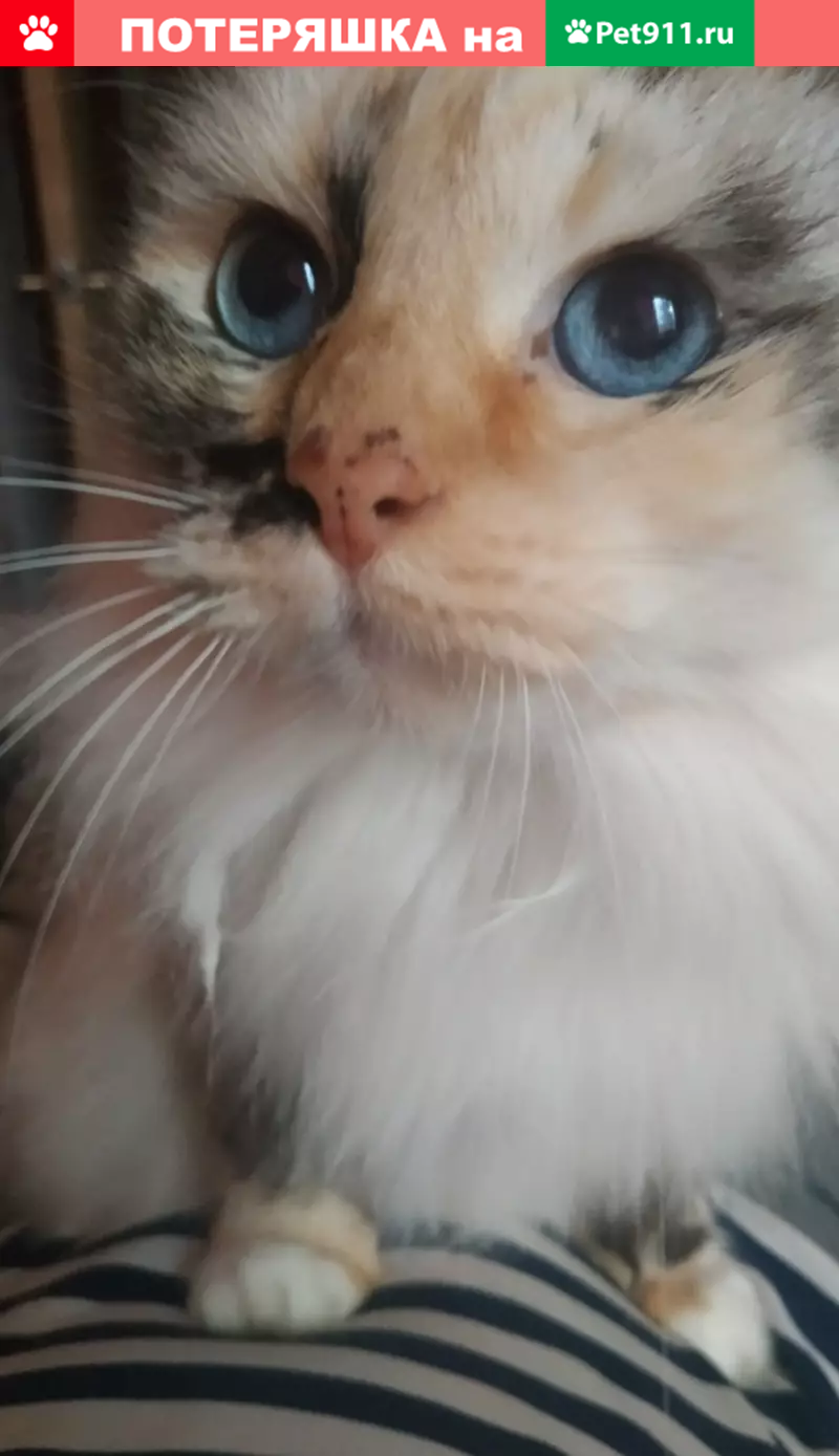 Пропала кошка, кличка Муся. Окрас белый с оранжевыми и черными пятнами, уши рыжие в черную крапинку, хвост серый, пушистая, глаза голубые. Ласковая, домашняя кошечка, в возрасте. Пропала примерно 9 мая во время дождя, предположительно выпрыгнула из окна. Помогите вернуть домой
