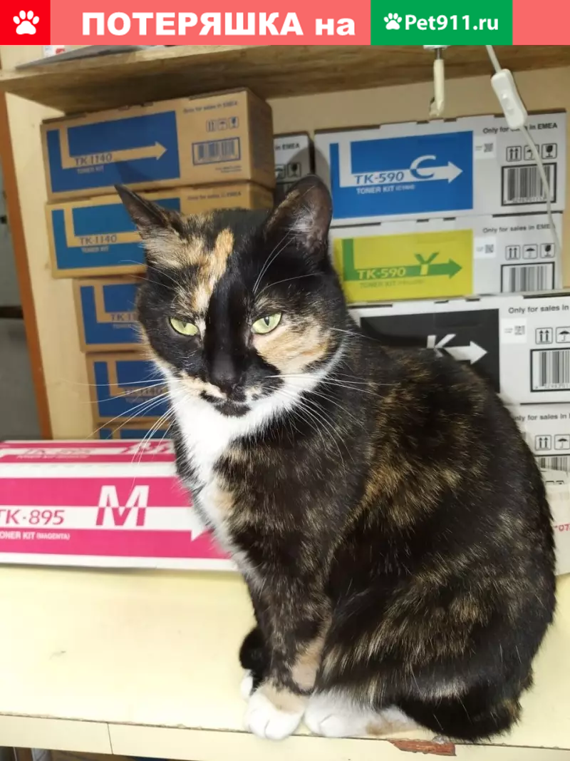 Пропала трехцветная кошка в районе ул.Пяловская ,5 А. 1.5 года , кличка Бася , в оранжевом ошейнике от клещей.