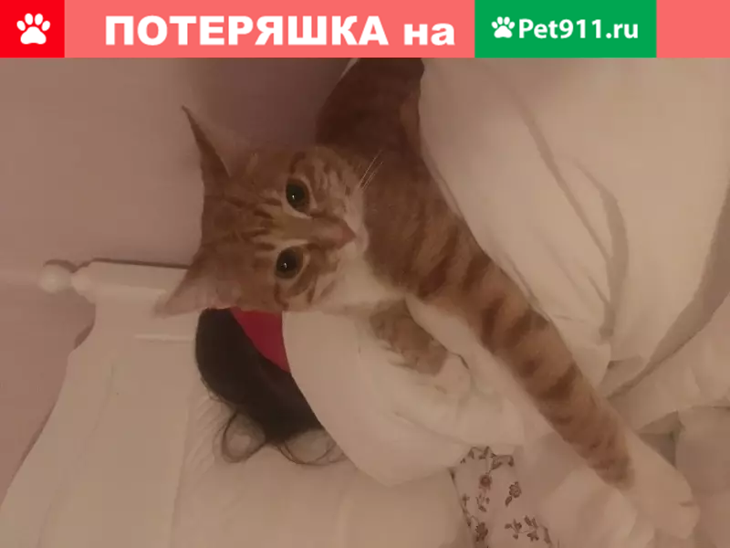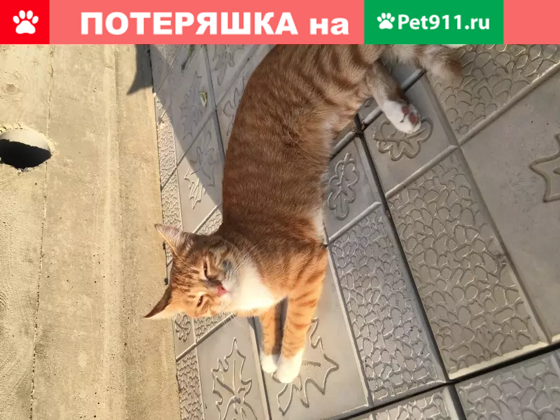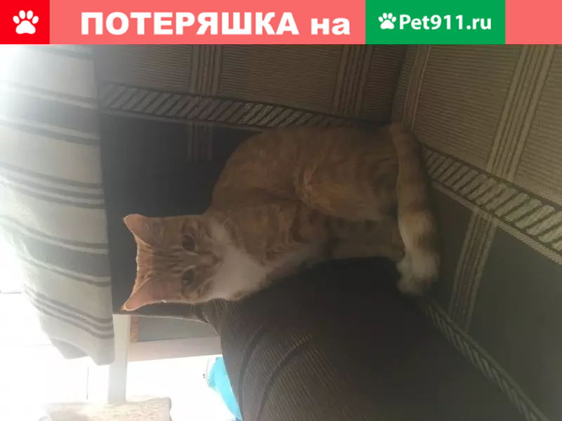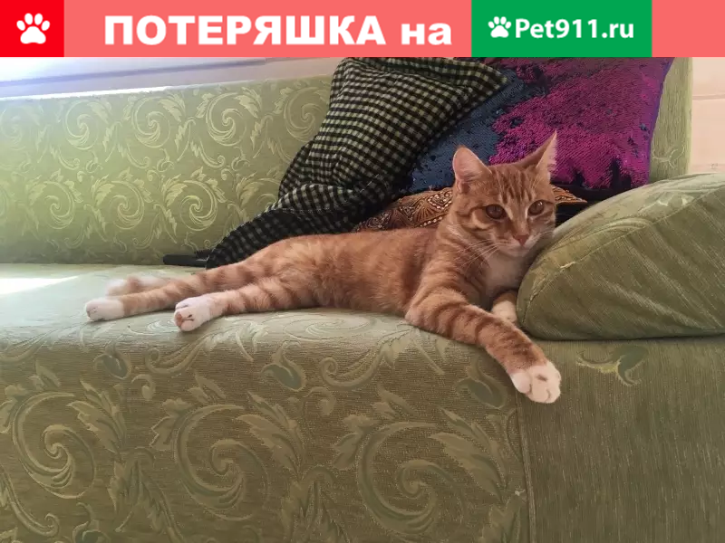 Ушёл с дачного участка. Молодой котик, 10 месяцев. Рыжий с жёлтыми глазами, белая грудка и белые лапки. На передней лапке рыжее пятно, хвост полосатый. Ласковый.