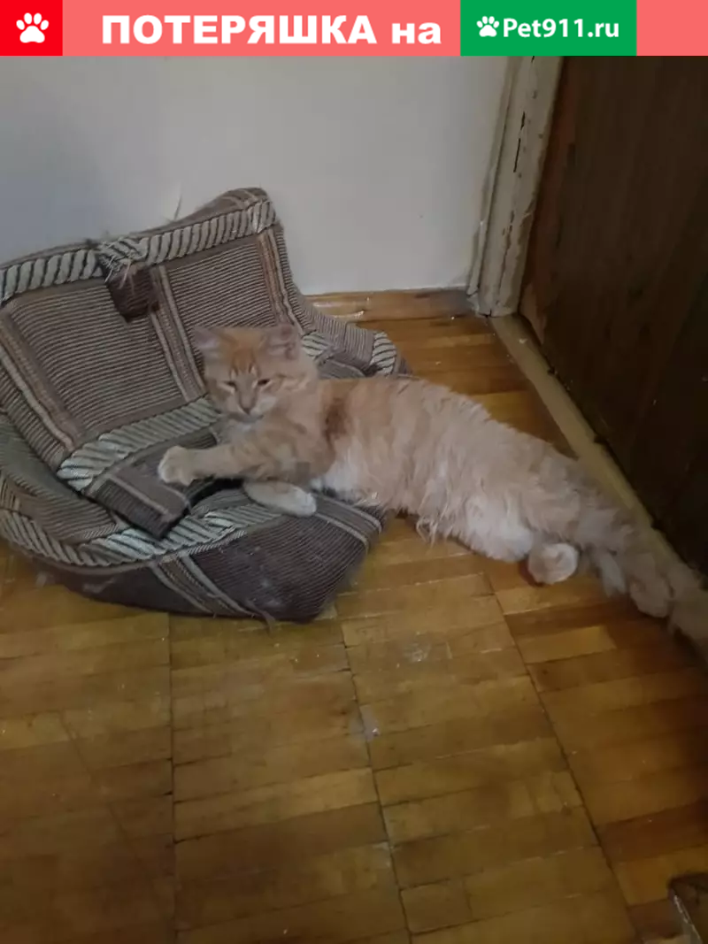Пропал котик, рыжий, пушистый, 10 месяцев. Выпрыгнул в окно первого этажа. Пропал по адресу: город Москва, улица Клары Цеткин, дом 17, район Войковский. Нашедшего просим вернуть за вознаграждение.