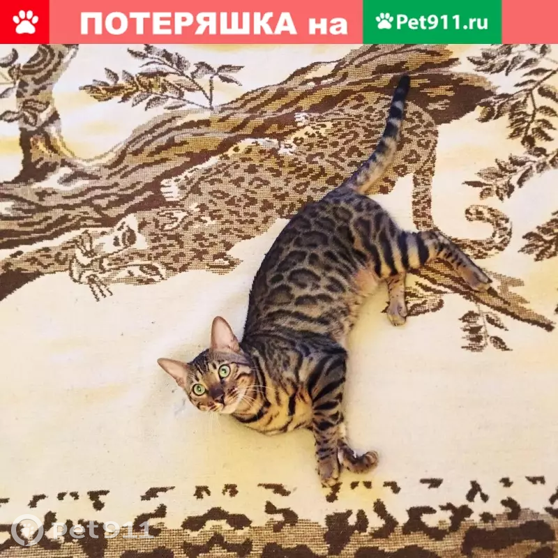 10.09.2019 в районе Зябликово, пойма р.Городянка, ул.Мусы Джалиля _ пропал кот породы бенгал, возраст 2 года, кастрирован. Предположительно выприыгнул с 1-го этажа. Пугливый, но не агрессивный. Нашедших или видевших - просьба откликнуться.