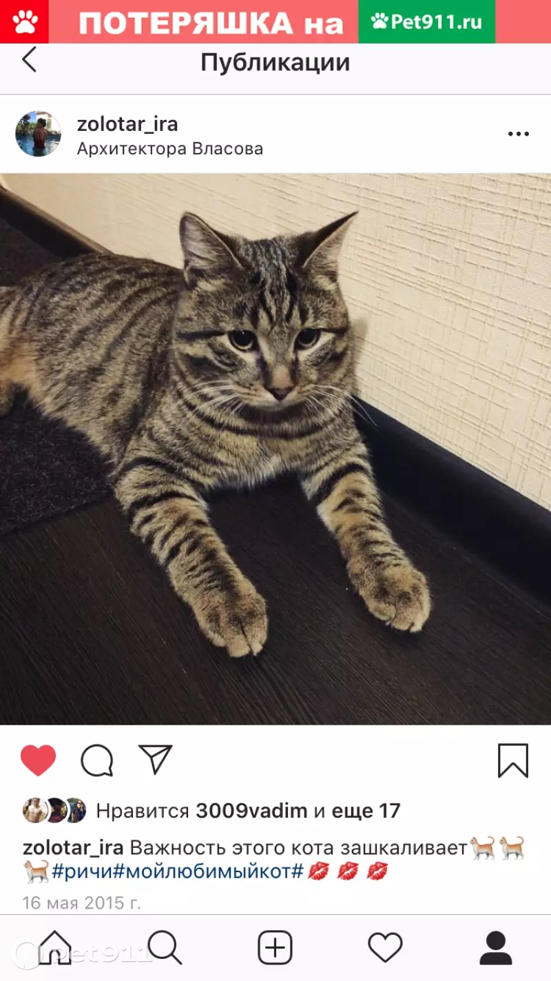 Полосатый , большой ! Откликается на кличку Ричи ! Очень ласковый но пугливый !!! Был ошейник красно коричневый
